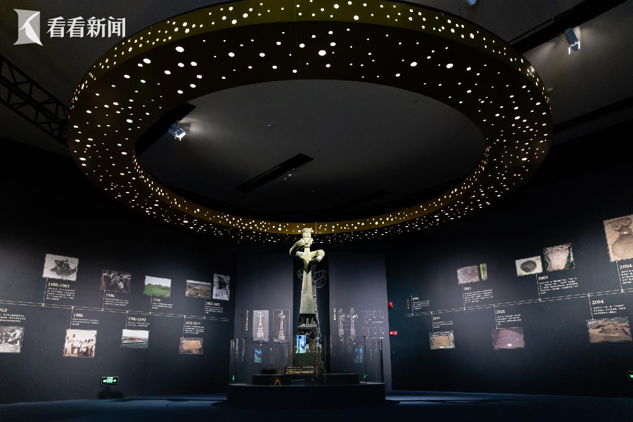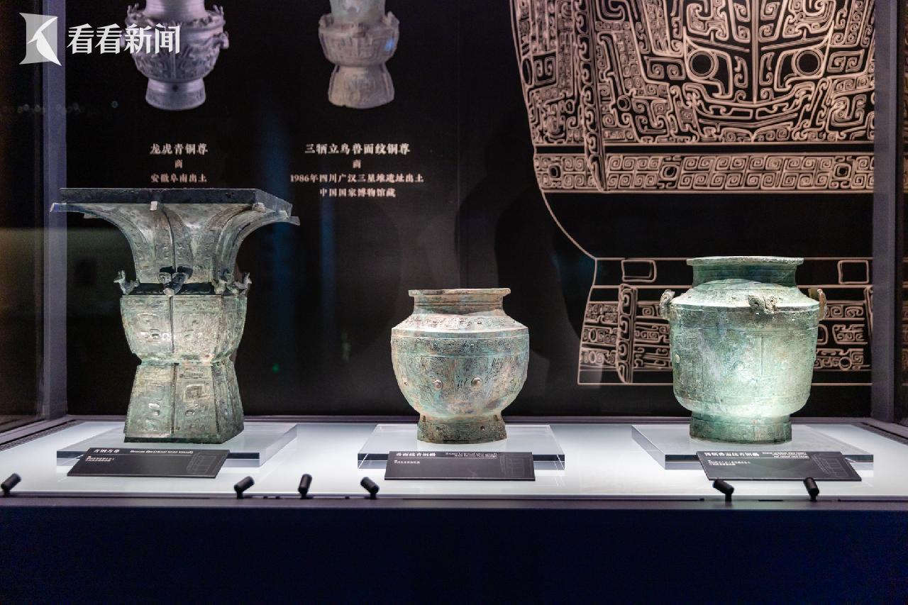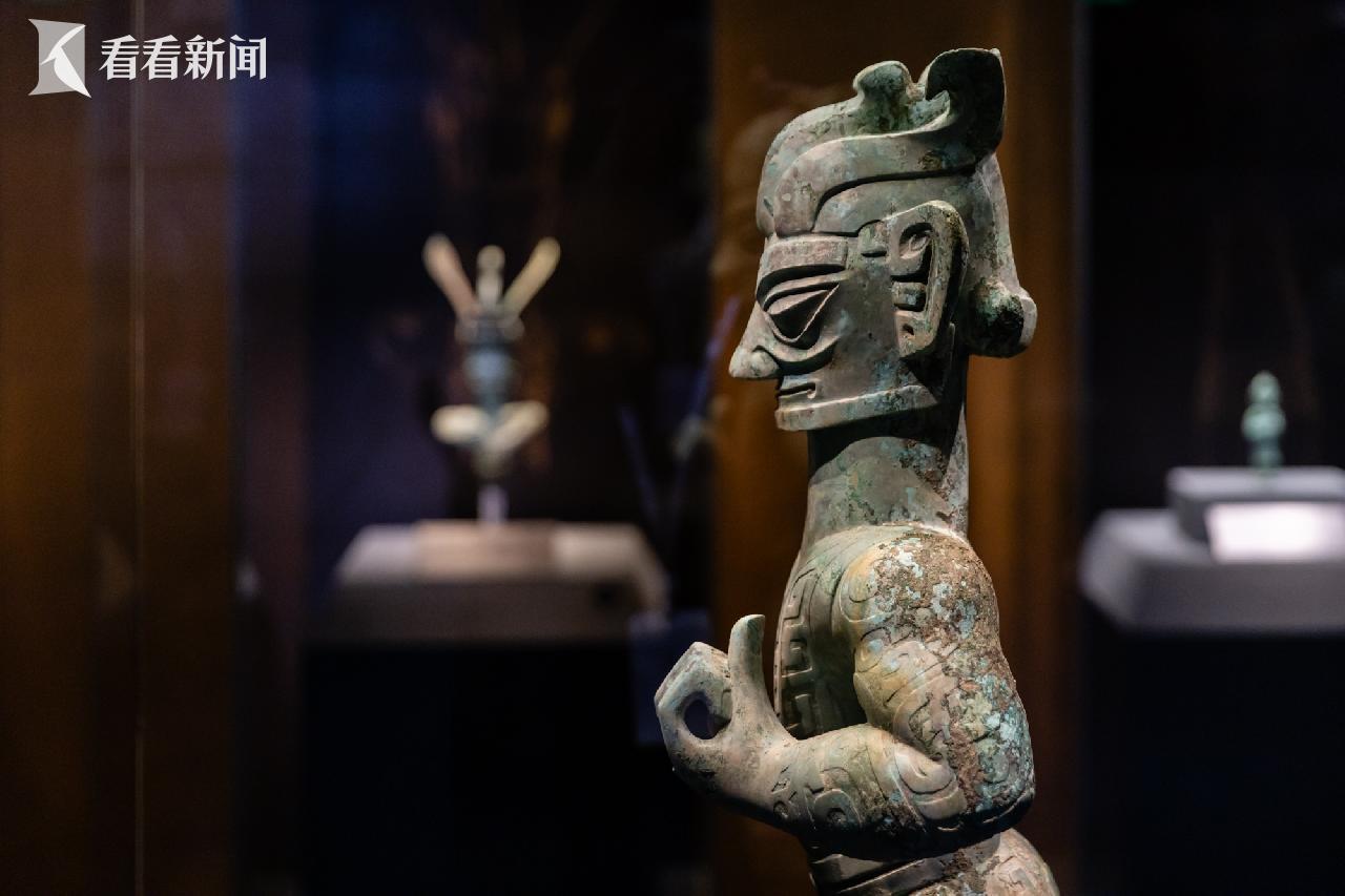 展品包括金辉璀璨的太阳神鸟金饰,双目如棱的戴金面罩青铜人头像,玄奇诡谲的戴冠纵目面具,以及青铜立人像、龙柱形青铜器、肩扛象牙人形纹玉璋等,这些先民的杰作,共同勾勒出一个瑰丽精彩的古蜀社会,也彰显了中华文明和而不同的宏大气象。