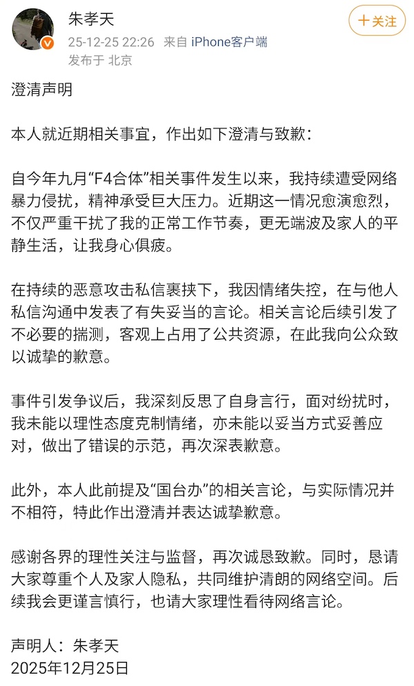 12月25日深夜,朱孝天在社交媒体上发布道歉声明: