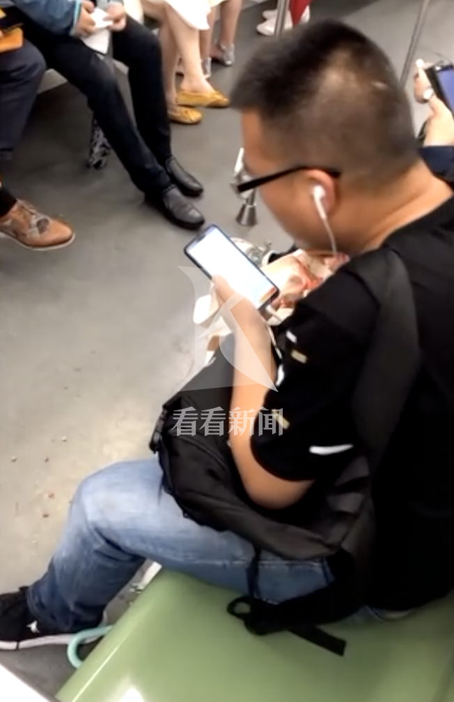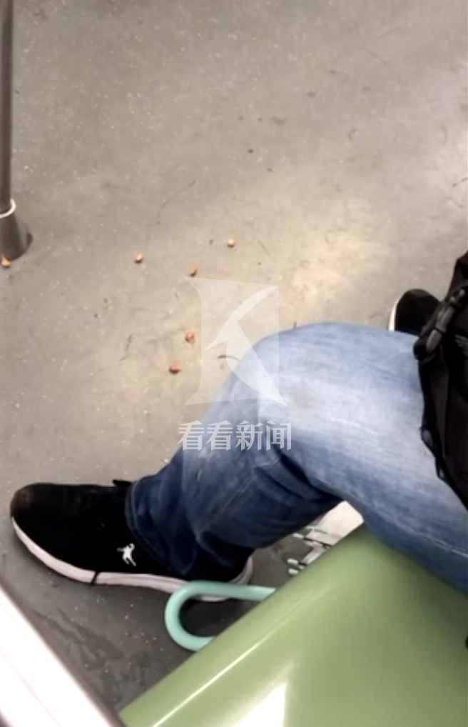 视频画面显示:一名身穿黑色衣服的男子坐在地铁的位置上,一边划着手机,一边从一旁的袋子中用叉子叉出水果,放入自己口中。几秒咀嚼后将果壳直接吐在地上,整个地面都铺满了男子吐下的果壳。而这名男子全程盯着手机屏幕,完全没有理会周边乘客的感受。