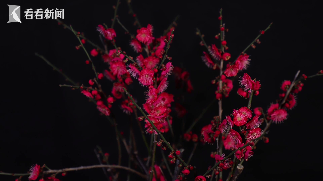 光影流转,绯红的梅苞绽放,黄色的花蕊缓缓舒展,一缕缕暗香浮动,尽显梅花清雅高洁的风骨。