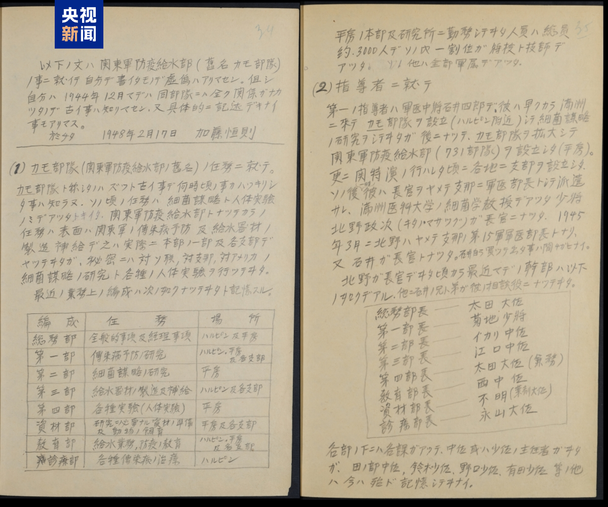近日,侵华日军第七三一部队罪证陈列馆公布一份题为《731部队海拉尔支部部队长加藤恒则笔供》的史料。该史料原件藏于俄罗斯联邦安全局外贝加尔边疆区分局,由普希金科学图书馆申请解密获取后,于今年2月将影印版捐赠到黑龙江哈尔滨侵华日军第七三一部队罪证陈列馆,主要记载了加藤恒则1948年2月被苏联逮捕后亲笔书写的供述材料,包含被捕者档案、个人信息登记表及详细罪行陈述三部分内容,由俄文和日文材料组成,日文是亲笔笔供,俄文是翻译稿。