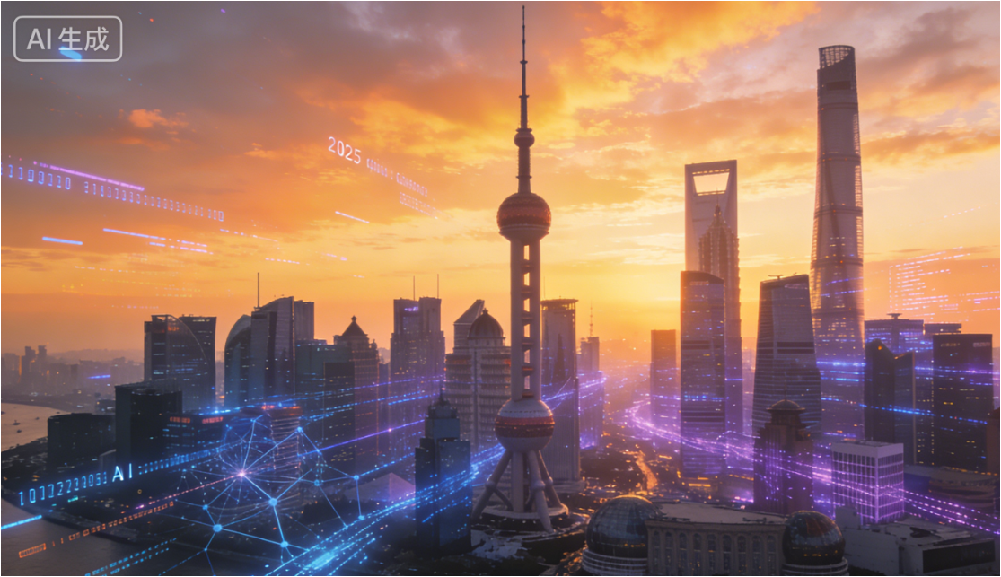 晨曦中的城市天际线与楼宇间穿梭的数据流交相辉映,伴随充满希望的背景音乐,2025年的中国AI叙事徐徐铺展。
