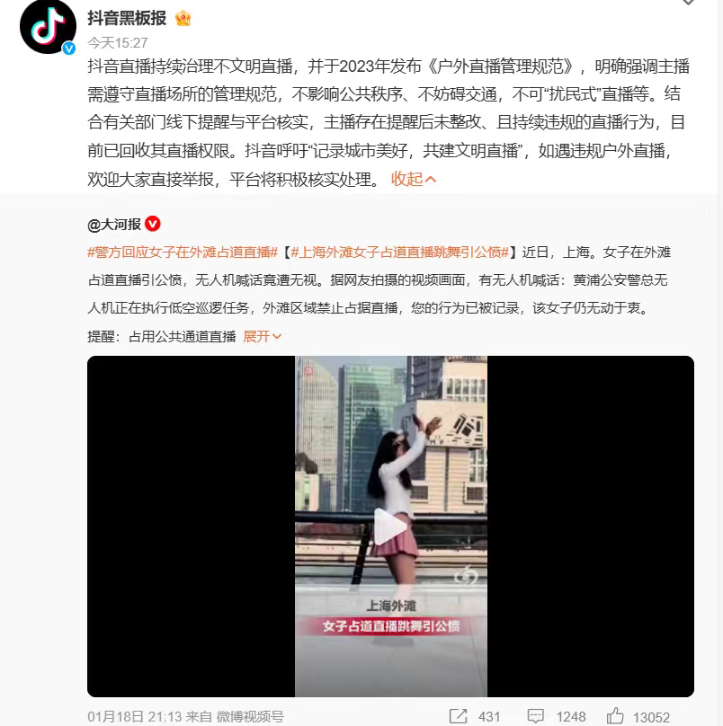 目前,相关短视频平台通报称,根据其发布的户外直播管理规范,结合有关部门线下提醒与平台核实,该主播存在提醒后未整改、且持续违规的直播行为,平台已回收其直播权限。