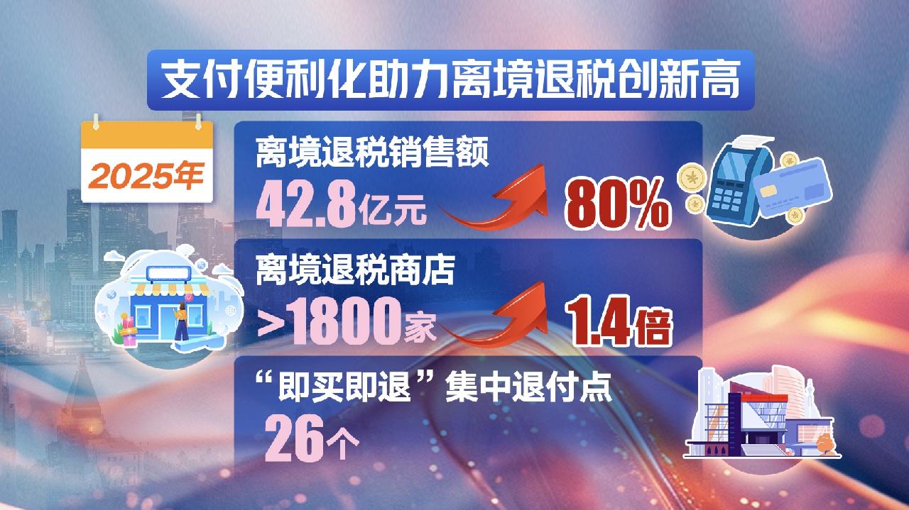 支付便利化也助力离境退税创新高。去年上海离境退税销售额同比增长约80%,达到了42.8亿元,占全国的近五成。这背后离不开广泛覆盖、便捷高效的退税服务网络。目前,上海离境退税商店超1800家,同比增长1.4倍,“即买即退”集中退付点增至26个。